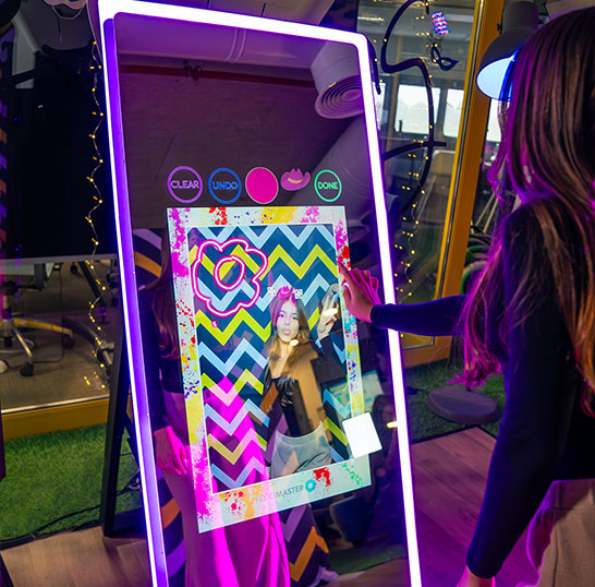 - Our Air Mirrors offer an immersive experience for guests through interactive animations, customizable messages, and touchscreen technology. Every interaction with the mirror becomes a memorable moment, enhancing the overall atmosphere of your event.